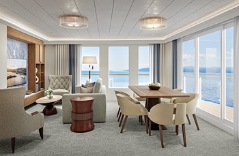A standout feature is the Signature Suite, the largest stateroom on any riverboat at over 1,500 square feet. This luxurious suite offers 180º panoramic views and a wraparound balcony outfitted with a full dining area, loungers, and additional seating to fully immerse guests in the ever-changing riverscape.