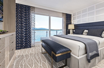 Veranda suites are 405 sq. ft. and floor-to-ceiling windows that overlook a spacious private balcony with a table and chairs. Each suite has a comfortable seating area and flat screen TV, as well as a breakfast bar with stocked refrigerator. King or two twin bed configurations are available. The bathroom has a large shower and is equipped with toiletries, hairdryer, plush towels and robes. Storage space in each Veranda Suite includes a wardrobe, full-size dresser, under-counter cabinet, and desk drawers. Each suite also has individual climate control, safe, USB charging ports, and complimentary WiFi.