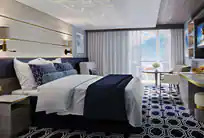 These spacious staterooms include a queen-size bed, sitting area and floor-to-ceiling glass doors that open onto a private balcony. Staterooms are priced exclusively for solo travelers and include access to the private Studio Lounge. (Stateroom: 176-277 sq. ft. Balcony: 38-90 sq. ft.)